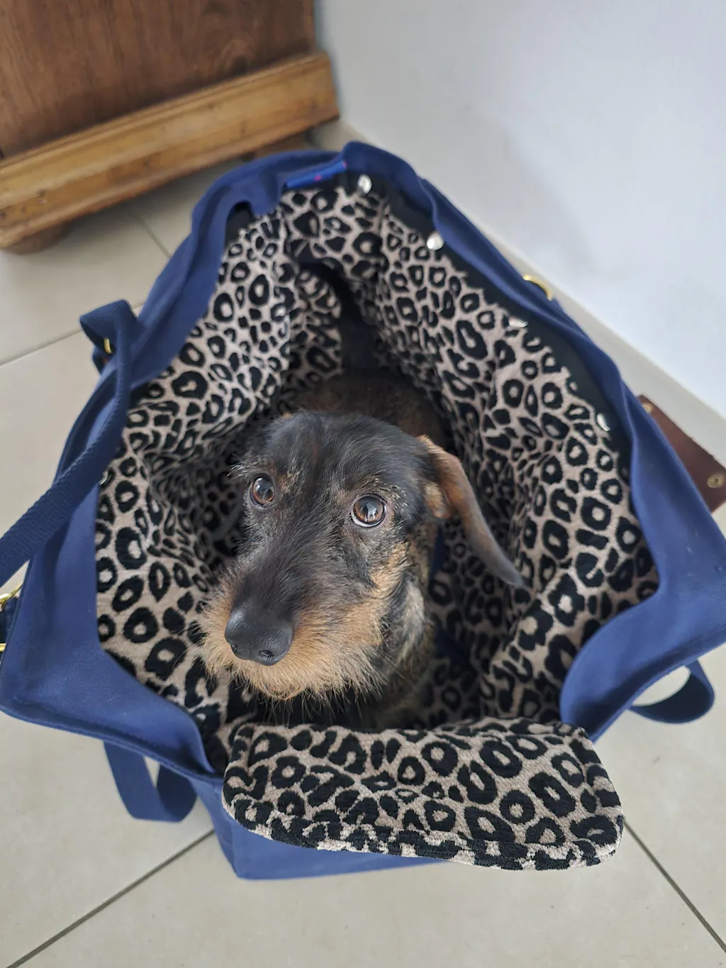 Starhundeklub-Mitglied Frieda, in der gemütlichen, handgefertigten Canvas Hundetasche von Greta & PAUL. Starhundeklub-Mitglied Klara, in dem gemütlichen, handgefertigten Hundpad von Greta & PAUL. Starhundeklub-Mitglied ohne Namen, in der gemütlichen, handgefertigten Canvas Hundetasche von Greta & PAUL.